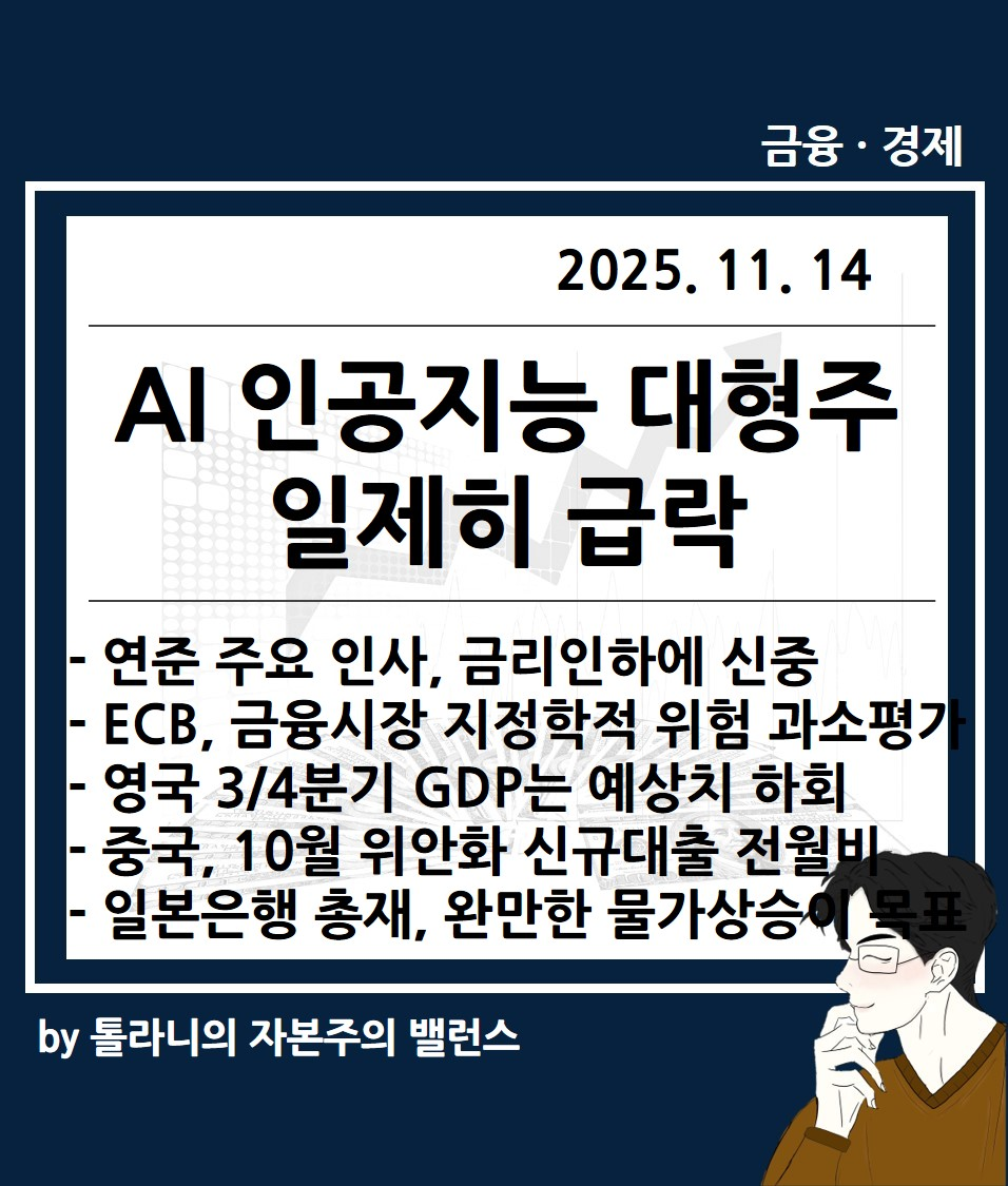 지금까지 ‘AI 대형주 일제히 급락, 연준 주요 인사, 금리인하에 신중 매파 발언 등 주요 국가 경제 및 금융 동향’ 관련하여 알아보았는데요.