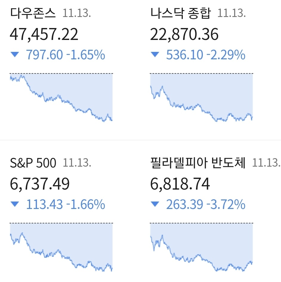 다우지수는 전일 대비 -1.65% 빠진 47,457.22에 거래를 마쳤으며 대형주 중심의 S&P500 지수는 전장 대비 -1.66% 내린 6737.49를 기록하였습니다. 기술주 중심의 나스닥 지수는 -2.29% 급락한 22,870.35 거래를 마치며 장을 마감하였습니다.