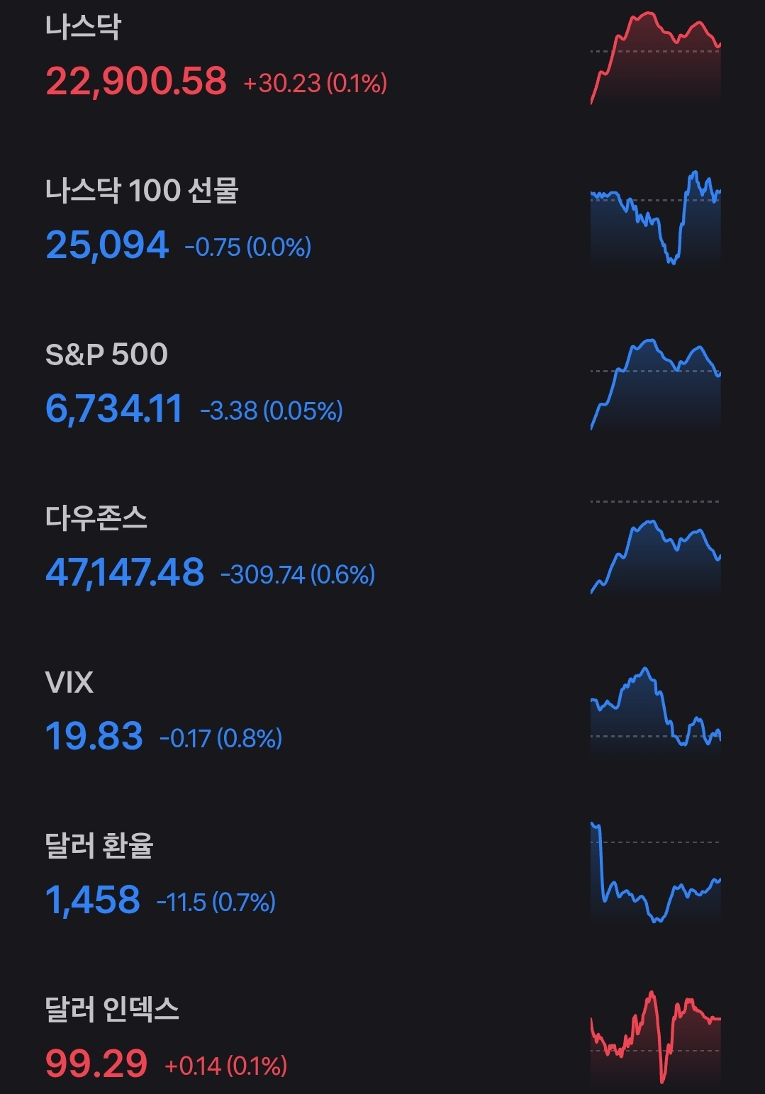 오늘 시장은 나스닥의 소폭 상승과 S&P500·다우지수의 하락이라는 온도차를 보이며 기술주의 견조함과 전통 산업의 부담이 뚜렷하게 대비되었습니다. VIX는 20 아래로 내려가 단기 충격보다는 조정 국면 성격이 강했고 원 달러 환율은 1400원대 중반에서 하락해 최근 급등에 따른 되돌림이 나타났습니다. 다만 연준의 12월 금리 인하 가능성이 절반 수준까지 떨어진 만큼 향후 지표 발표마다 시장 반응이 민감해질 수 있고 공포 탐욕 지수가 극단적 공포 구간에 머물며 투자 심리 위축이 상당하다는 점도 확인할 수 있습니다.
