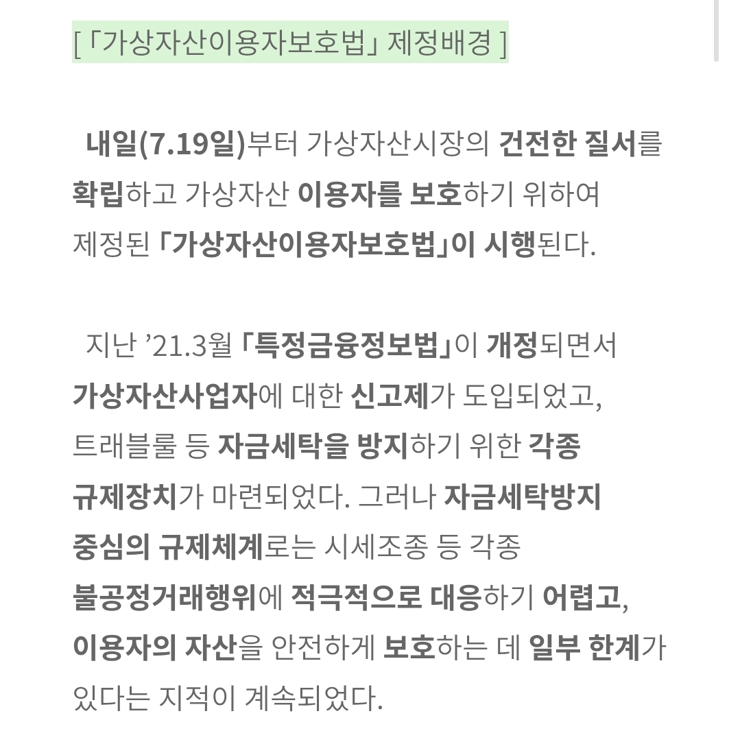 예컨대 가상자산이용자 보호 등에 관한 법률이 2024년 7월 19일부로 시행되면서 이용자 보호, 불공정거래 규제, 사업자 감독 등 제도적 기반이 강화됐습니다.