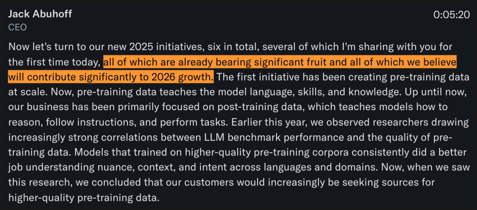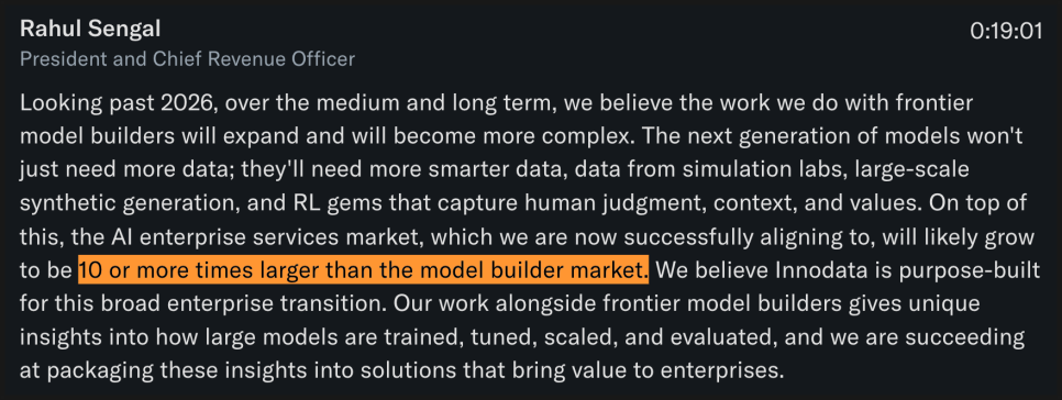 그 결과, 사전학습 데이터 관련 신규 계약 규모만 약 6,800만 달러에 이르며, 대부분의 매출은 2026년에 반영될 것으로 보입니다. 잭 CEO는 “사전학습 데이터는 차세대 LLM의 핵심 경쟁력으로 떠오르고 있다”며 “이노데이터가 그 초기에 자리 잡았다는 점이 매우 전략적”이라고 강조했습니다.