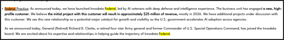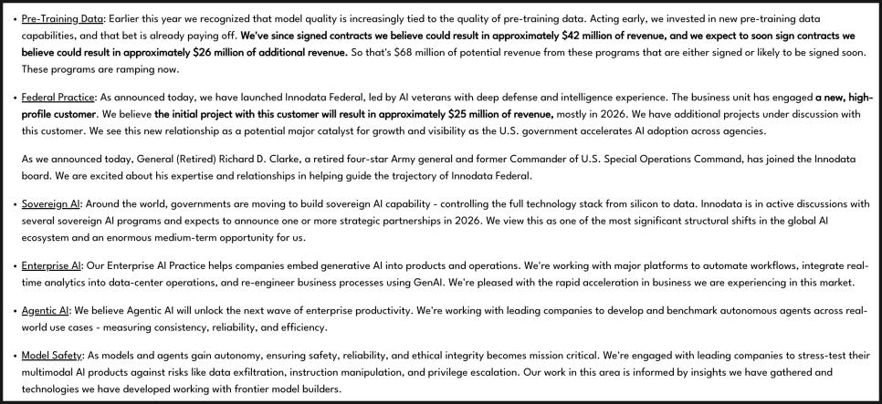 이번 분기 가장 상징적인 발표는 6가지 핵심 투자 분야 중 하나인 ‘이노데이터 페더럴(Innodata Federal)’의 공식 출범입니다. 미 국방·정보·행정 기관을 대상으로 하는 AI 솔루션 전담 조직인데, 민간 중심의 기존 고객 포트폴리오를 넘어 공공 부문으로의 진출을 본격화한 것이죠. 첫 프로젝트는 이미 2,500만 달러 규모 계약으로 시작되었다는데, 대부분의 매출은 2026년에 인식될 예정이라고 합니다.