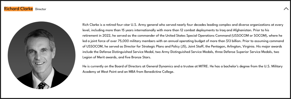 또한 미 특수작전사령부(SOCOM) 출신의 4성 장군 리처드 D. 클라크(Richard D. Clark)가 새로 이사회에 합류했습니다. 국방 및 정보 분야 인맥을 통해 연방사업을 본격적으로 확장하기 위한 인선으로 보입니다.