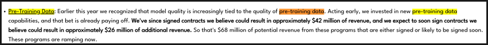 또한 이노데이터는 전통적인 ‘포스트 트레이닝 데이터(Post-training data)’ 제공에서 벗어나, 이제는 사전학습 데이터(Pre-training data) 시장으로 발을 넓히고 있습니다. LLM(대규모 언어모델)의 성능이 사전학습 데이터 품질에 직접적으로 영향을 받는다는 연구 결과에 주목하고, 여기에 130만 달러를 선제적으로 투자했습니다.