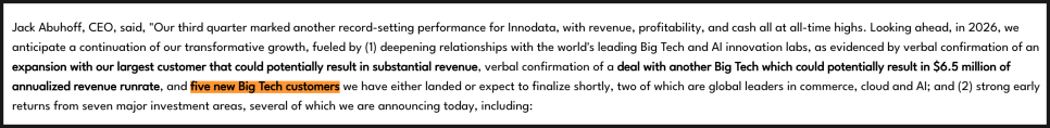 잭 아부호프(Jack Abuhoff) 최고경영자(CEO)는 이번 실적 발표에서 “기존 고객의 신뢰 강화와 신규 빅테크 5곳 확보”를 핵심 성과로 꼽았습니다. 이로써 이노데이터는 총 13곳 이상의 글로벌 빅테크 기업들과 협력 관계를 맺고 있으며, 그중 6곳은 내년에 매출이 ‘상당히 크게’ 늘어날 것으로 예상된다고 밝혔습니다.