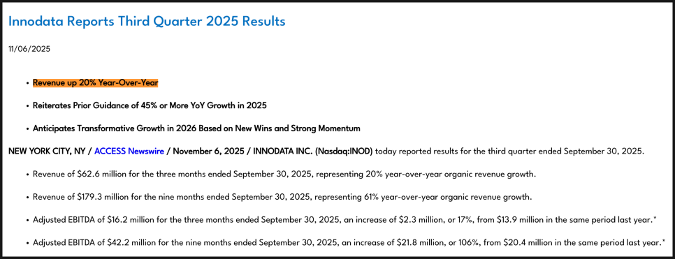 이노데이터는 2025년 3분기 매출 6,260만 달러를 기록하며 전년 대비 20%, 전분기 대비 7% 유기적 성장을 달성했습니다. 여기서 ‘유기적 성장’이란 인수합병이나 일회성 요인이 아닌, 기존 사업의 자연스러운 성장으로 인한 매출 증가를 뜻합니다.