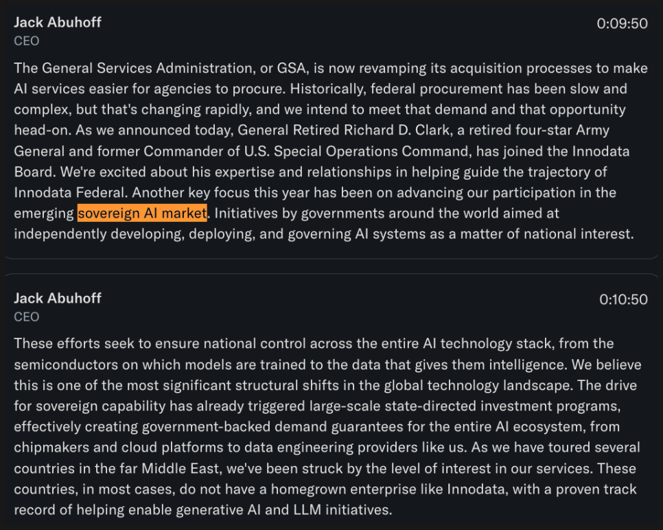 한편 이노데이터는 글로벌 정부들이 자국 내 AI 인프라를 직접 개발·운영하려는 움직임을 ‘주권형 AI(Sovereign AI)’로 규정하고, 이를 새로운 성장 엔진으로 삼고 있습니다. CEO는 “중동 및 기타 지역 국가들이 자국 데이터 주권을 확보하려는 움직임이 빠르게 확산 중이며, 이노데이터는 그들의 신뢰할 수 있는 파트너로 주목받고 있다”고 밝혔습니다.