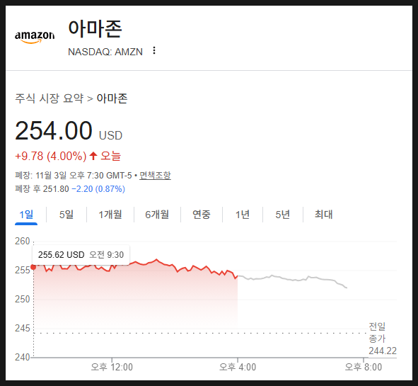 아마존의 주가는 전일 대비 4% 상승한 254달러에 장을 마감했습니다.