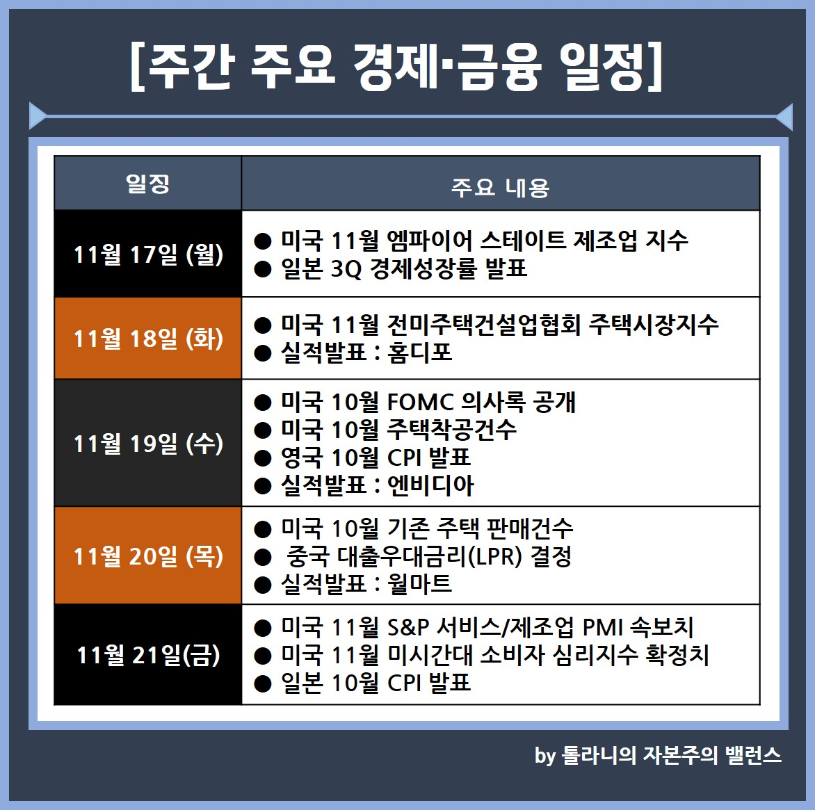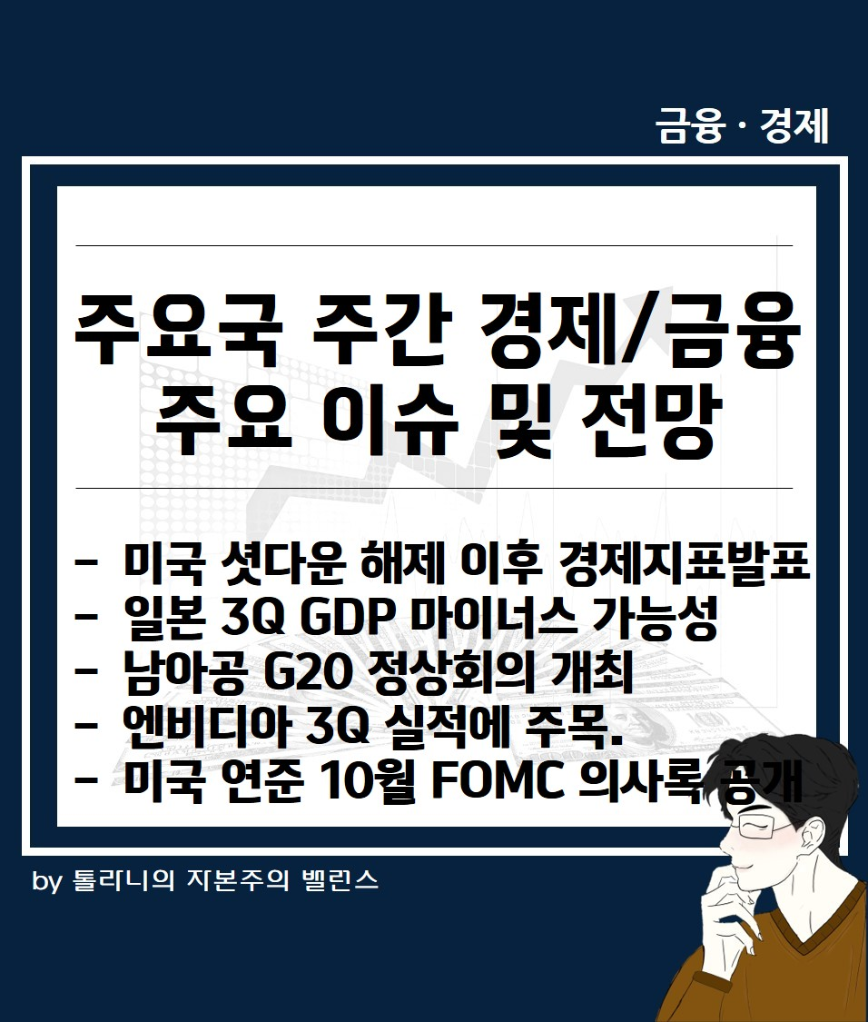 지금까지 '엔비디아 3Q 실적 주목, 10월 FOMC 의사록 공개 등 미국 주간 증시 일정 및 주요 국가 경제·금융 이슈' 관련하여 알아보았는데요.
