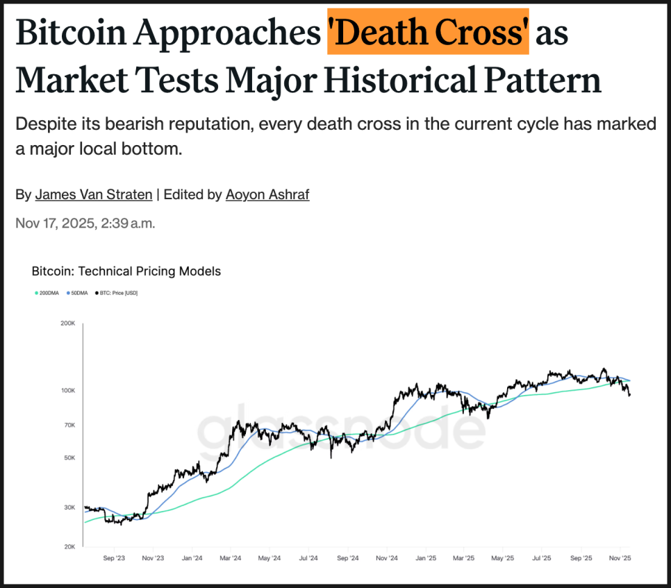 한편 비트코인은 현재 약 25% 하락하며 10월 사상 최고가 126,000달러 에서 94,000달러 부근으로 내려왔습니다. 기술적으로는 단기 이동평균선(50일) 이 장기 이동평균선(200일) 아래로 떨어지는 ‘데스 크로스’가 임박했습니다. 일반적으로 이는 약세 신호로 해석되지만, 흥미롭게도 이번 주기에서는 오히려 반등의 시점과 맞물려 왔다는 해석도 있는데요.