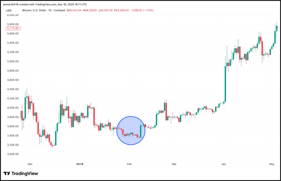 현재의 조정은 41일째이며, 낙폭도 약 25%로 과거보다 완만한 편입니다. 게다가 11월 12일 미국 정부가 셧다운을 해제한 직후라는 점도 주목할 만합니다. 2019년에도 비슷한 상황이 있었는데, 당시 비트코인은 정부 재개 후 9% 하락했다가 2주 만에 회복했습니다. 이번에도 같은 패턴이 반복될지 시장의 관심이 집중되고 있습니다.