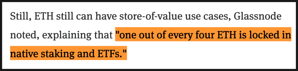 현재 전체 이더리움의 4분의 1(약 25%) 은 스테이킹 또는 ETF에 잠겨 있으며, 이는 자산으로서의 안정적 가치와 네트워크 운영 자산이라는 이중적 성격을 동시에 보여줍니다.