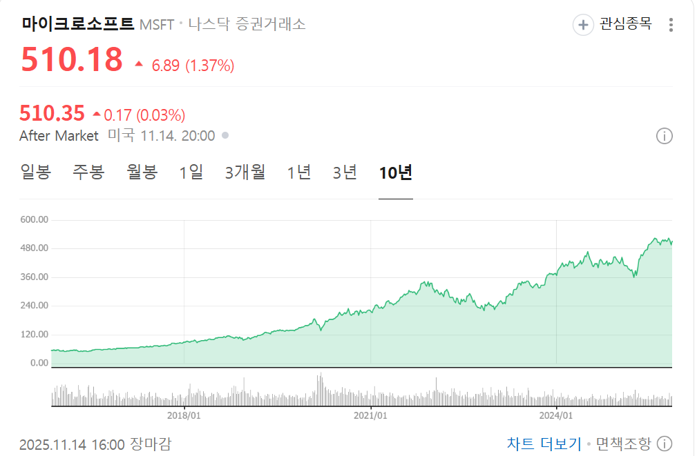 또 한국의 투자 환경을 생각하면, 국내에서 AI 인프라·플랫폼·모델을 동시에 장악한 기업은 사실상 없습니다. 네이버, 카카오, 통신 3사, 일부 제조 대기업들이 각각의 영역에서 노력하고 있지만, 글로벌 단위에서 봤을 때는 대부분 마이크로소프트·아마존·구글과 같은 거대 플레이어의 플랫폼 위에서 서비스를 올리는 구조입니다. 즉, 한국 경제 전체의 디지털 전환과 AI 도입이 가속화될수록, 역설적으로 국내 기업뿐 아니라 마이크로소프트 같은 외국 플랫폼 사업자의 캐시플로우도 함께 커지는 구조입니다. 한국 투자자 입장에서 “국내 AI 수혜주”만 보고 갈 것이 아니라, 그 위에서 구조적으로 이익을 취하는 글로벌 플레이어도 함께 담아야 하는 이유입니다.