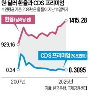 국가부도 위험을 나타내는 신용부도스와프(CDS) 프리미엄은 지난 14일 기준 0.2248%포인트로 금융위기 당시 최고점 6.99%포인트(2008년 10월 27일)와 비교해 15분의 1 수준에 불과
