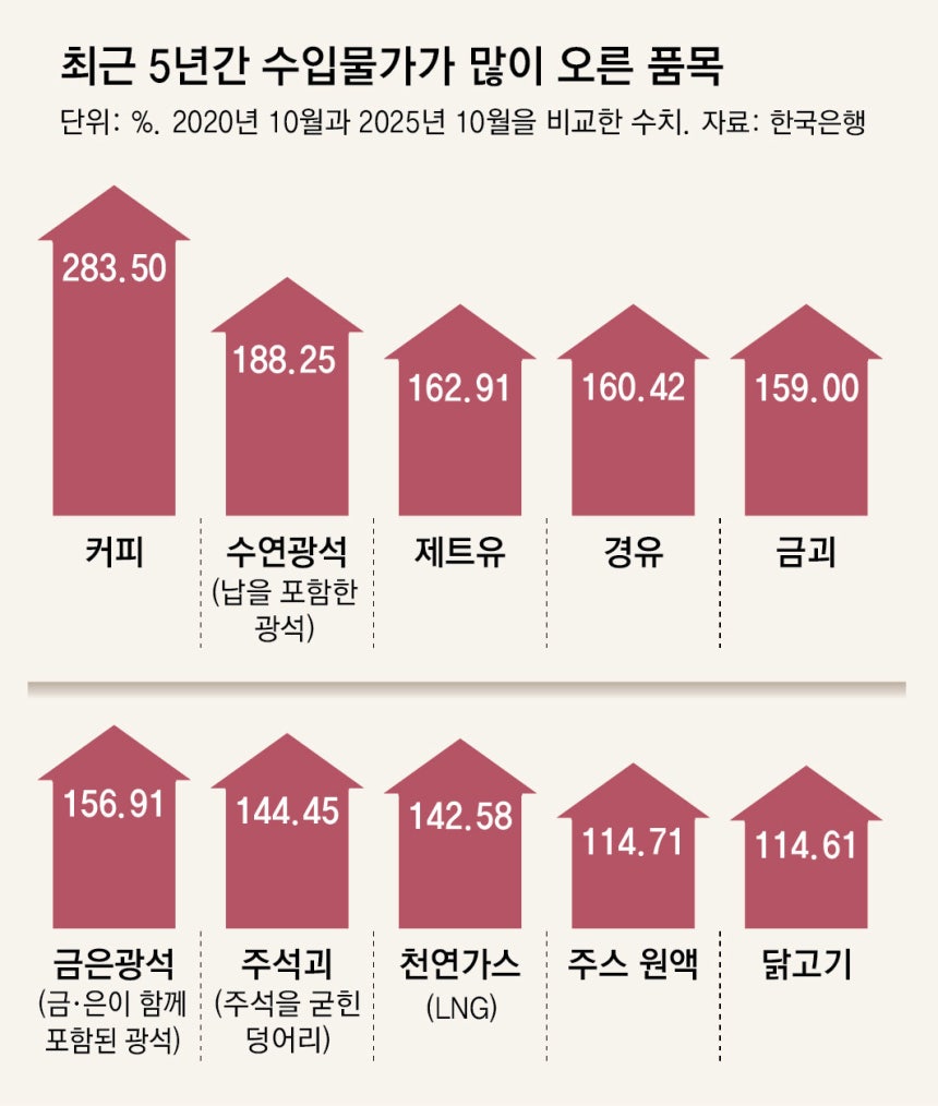 실제로 한국은행에 따르면 최근 5년간(2020년 10월과 2025년 10월 비교) 수입물가 중 기업들이 많이 수입하는 원재료와 중간재 수입물가가 유독 많이 뛰었음