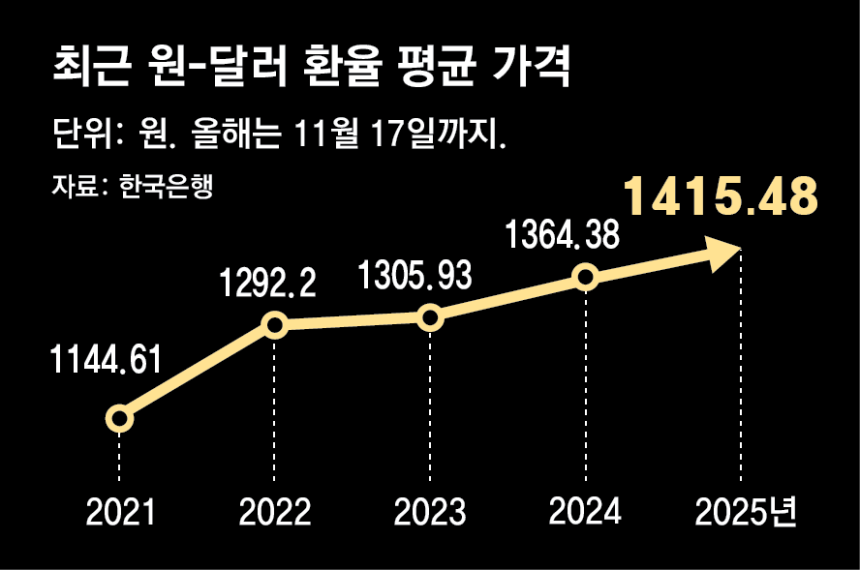 팬데믹과 미중 갈등 등 글로벌 무역질서가 새로 짜이는 가운데 원-달러 환율은 고공행진해 왔음. 연평균 환율은 2021년 1144.61원에서 매년 올라 올해는 이달 17일까지 평균 환율이 1415.48원으로 치솟았음