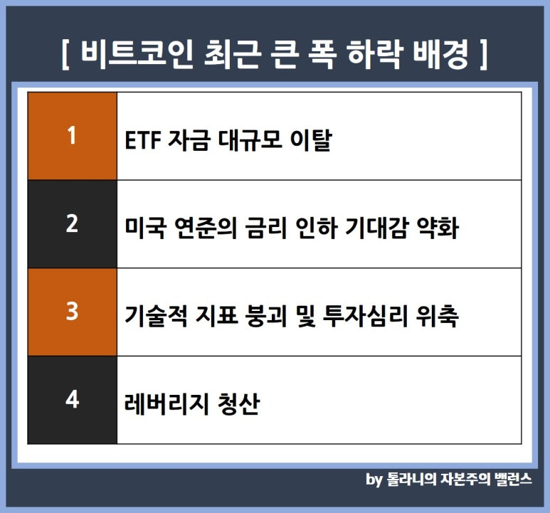 일각에서는 비트코인 하락세가 지속되고 있는 원인을 1) 비트코인 ETF 자금 대규모 이탈, 2) 미국 금리인하 기대감 약화, 3) 기술적 지표 붕괴 및 투자 심리 위축 그리고 4) 레버리지 청산 확대 등의 원인들이 복합적으로 작용했기 때문으로 분석 하고 있습니다.