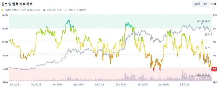 ● 또한 투자심리를 보여주는 지수는 17점(극단적 공포) 수준으로, 투자자들이 손실 회피에 집중하면서 매도세가 강화며, 일부 차익실현 매물이 쏟아지면서 투자자들의 불안감이 커지고 있는 상황입니다.
