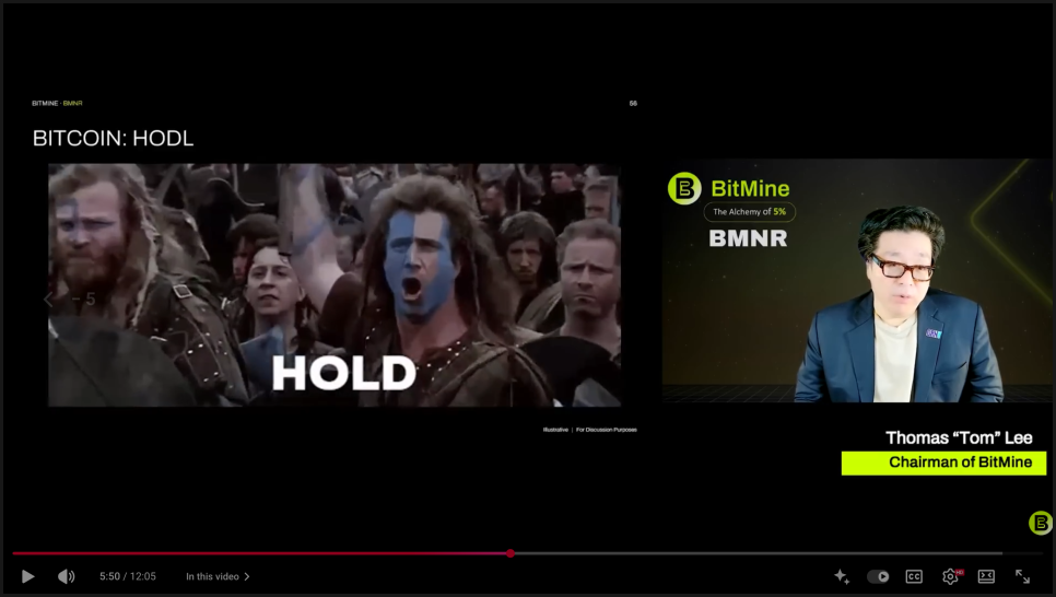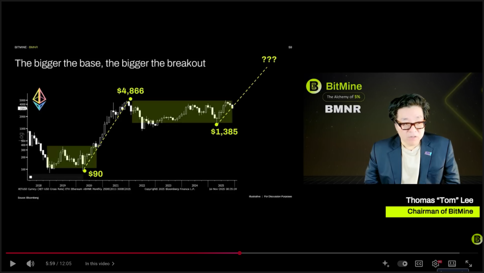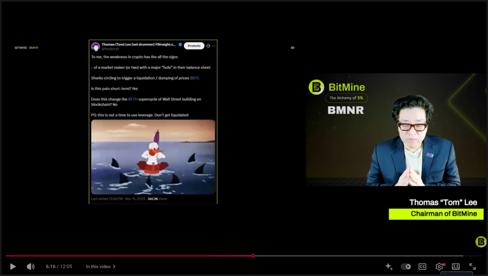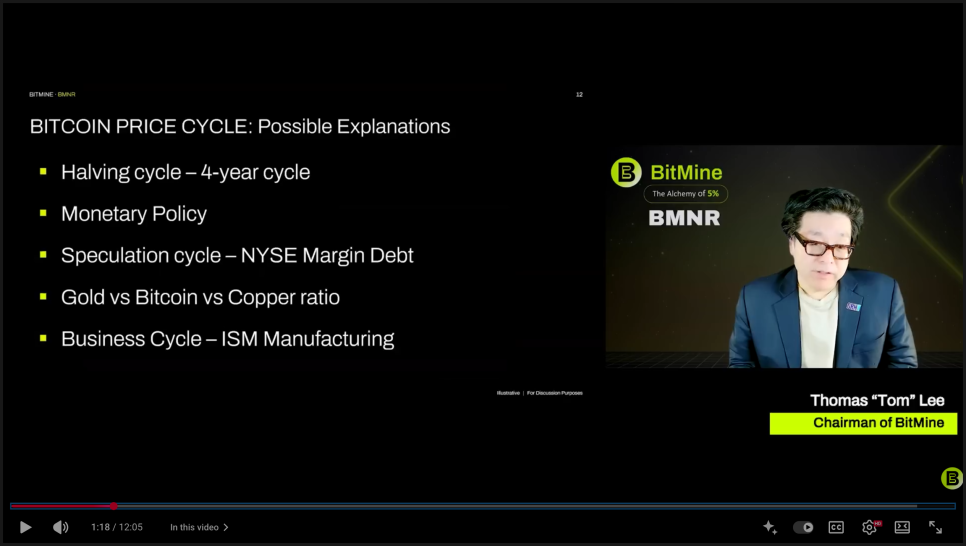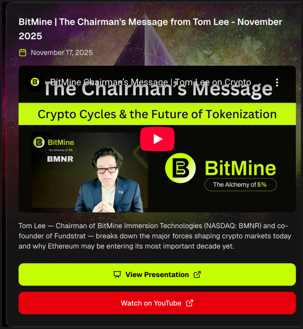 이런 와중에 비트마인은 회사 이사회 의장인 토머스 리(Thomas Lee)을 통해 '11월 의장 메시지'를 발표했습니다. 톰 리는 미국의 투자리서치 기관 ‘펀드스트랫(Fundstrat)’의 공동창업자로도 잘 알려져 있으며, 암호화폐와 시장 사이클 분석에서 영향력이 큰 인물인데요. 비트마인 오피셜 유튜브 채널에서 약 12분 동안 메시지를 전했습니다.