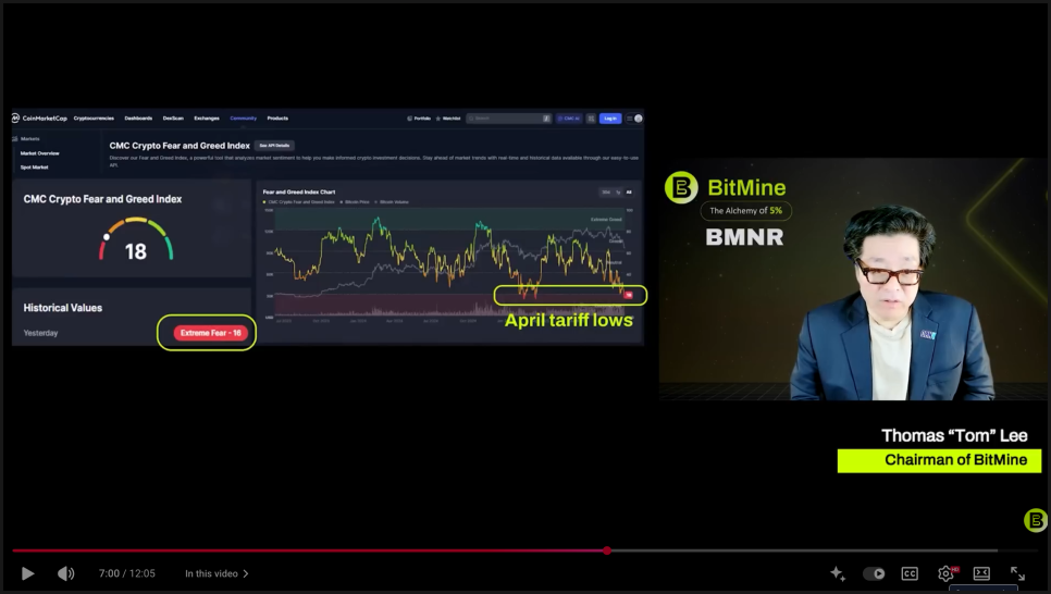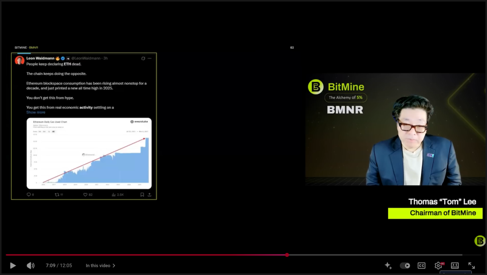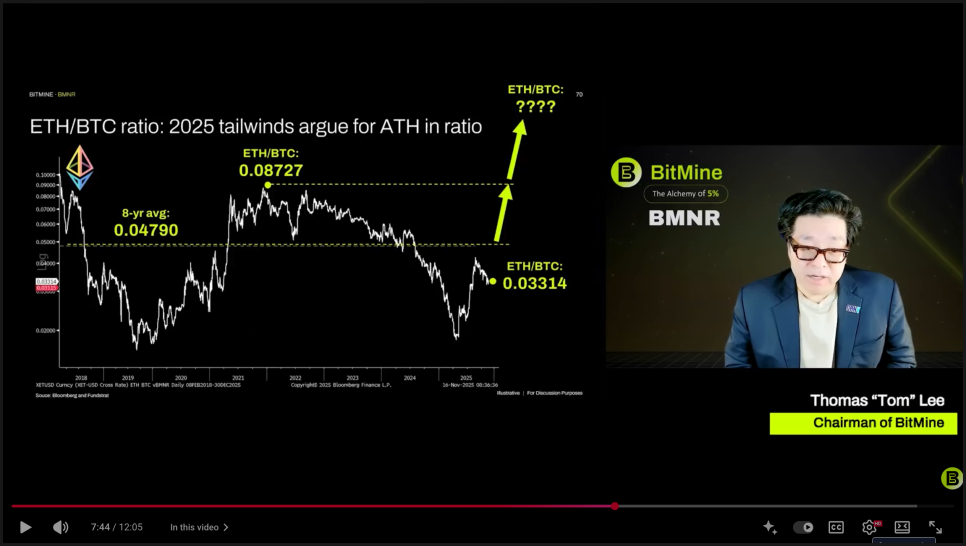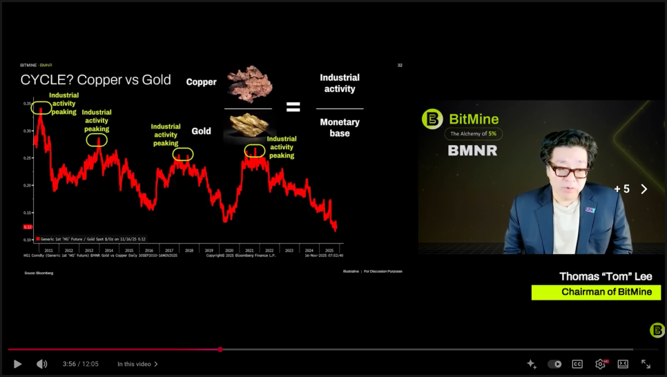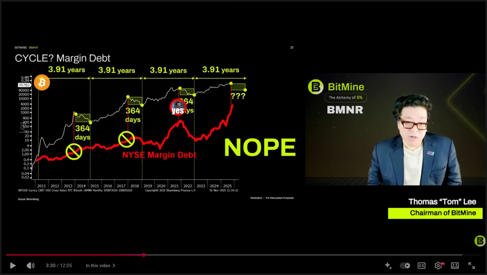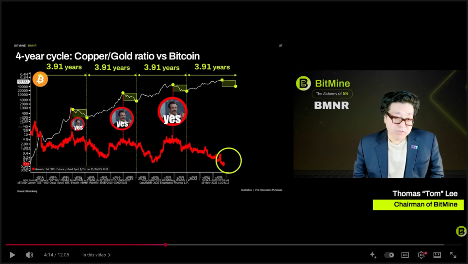 이런 와중에 비트마인은 회사 이사회 의장인 토머스 리(Thomas Lee)을 통해 '11월 의장 메시지'를 발표했습니다. 톰 리는 미국의 투자리서치 기관 ‘펀드스트랫(Fundstrat)’의 공동창업자로도 잘 알려져 있으며, 암호화폐와 시장 사이클 분석에서 영향력이 큰 인물인데요. 비트마인 오피셜 유튜브 채널에서 약 12분 동안 메시지를 전했습니다.