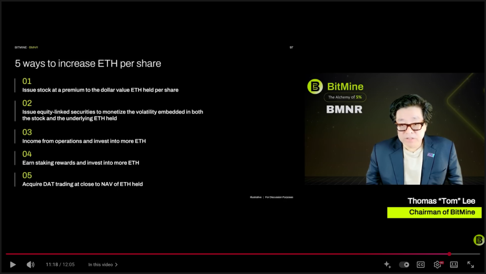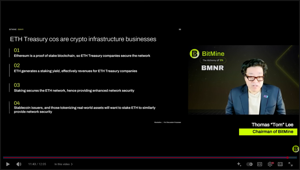 쉽게 말하면, 비트마인은 이더리움을 많이 사서 들고 있는 회사가 아니라 이더리움을 기반으로 EPS를 키우는, 일종의 이더리움 기준 버크셔 해서웨이가 되려는 회사라는 메시지라 해석할 수 있죠. 그는 이러한 방식의 트레저리가 앞으로 점점 더 일반적인 비즈니스 모델이 될 것이라고 전망합니다.