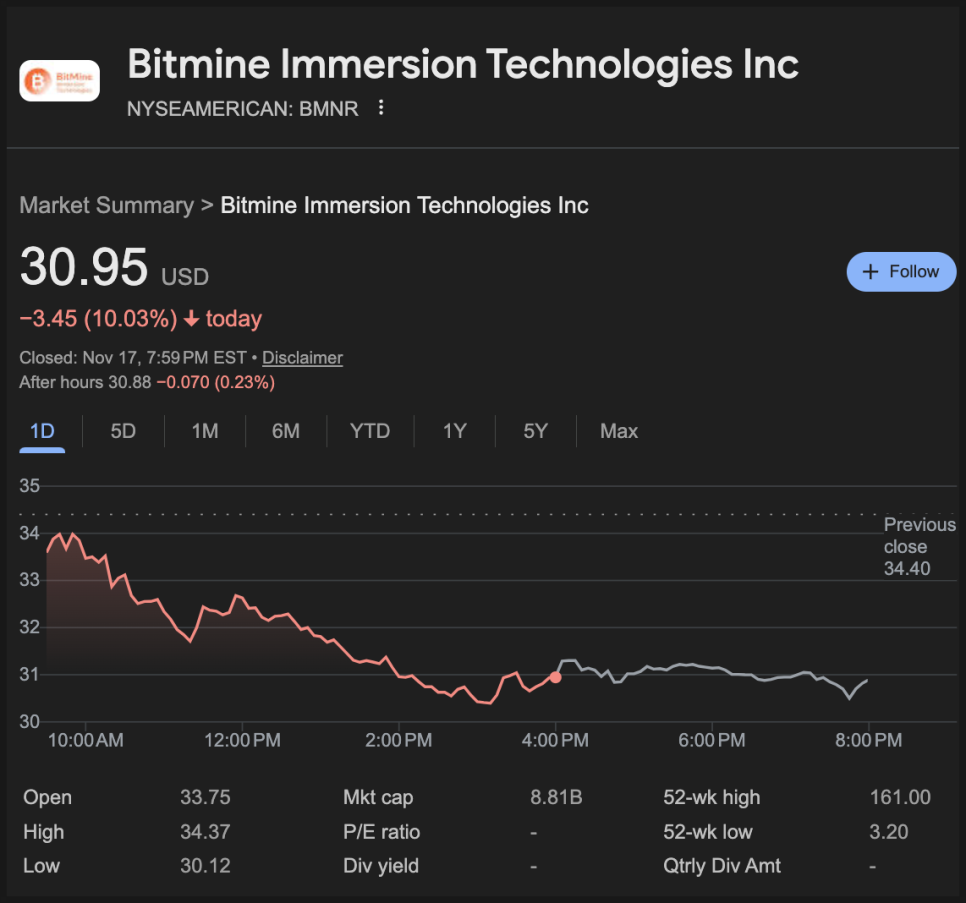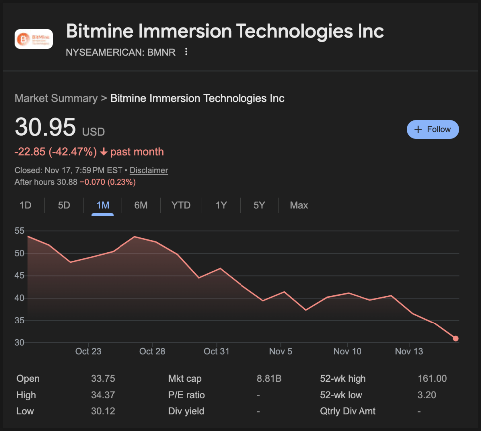 이렇게 확신에 차있는 메시지와 이더리움 대규모 매수 소식에도 불구하고 BMNR 주가는 발표 당일 10% 급락했습니다. 최근 한 달 동안엔 약 40퍼센트 하락했는데, 이더리움이 떨어지고 있으니 어쩔 수 없는 부분입니다.