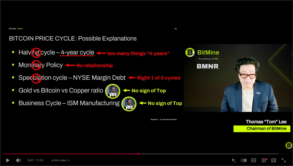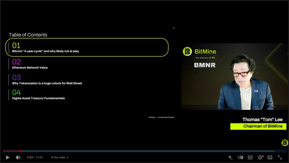 이번 메시지에서 톰 리 회장은 비트코인 사이클 해석의 변화, 최근 암호자산 조정의 원인, 이더리움의 구조적 가치, 그리고 토큰화의 장기적 잠재력, 이렇게 네 가지 주제를 다뤘습니다. 이로써 비트마인이라는 회사가 왜 공격적으로 이더리움을 매집하는지, 그리고 앞으로 어떤 산업적 구조 변화를 예상하는지를 역설했는데요.