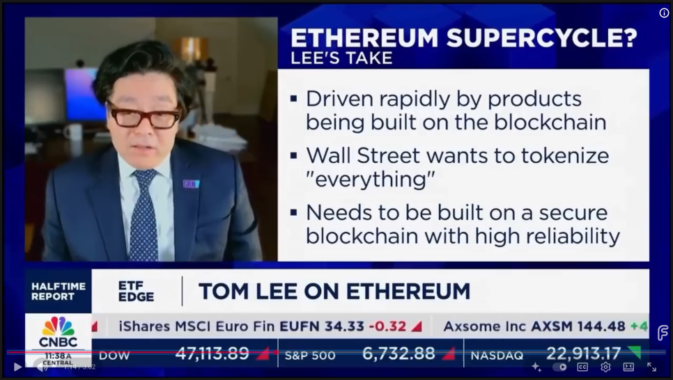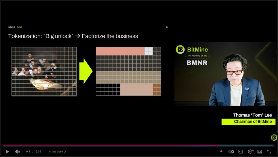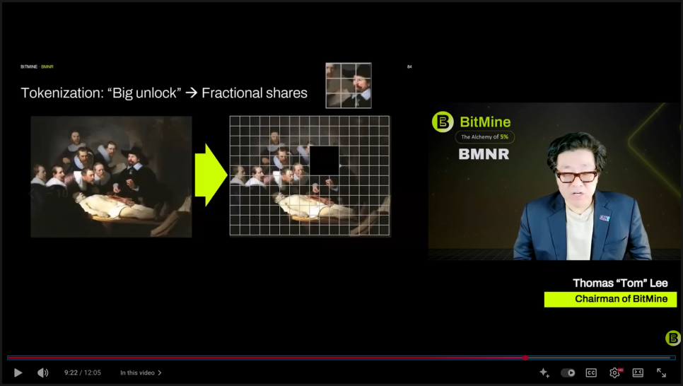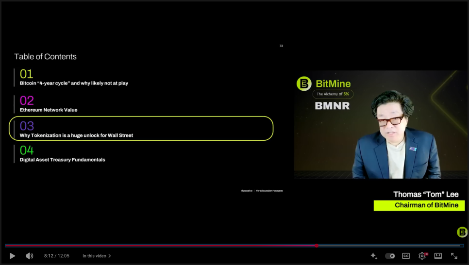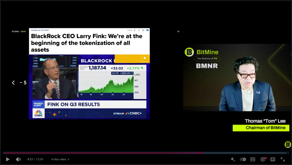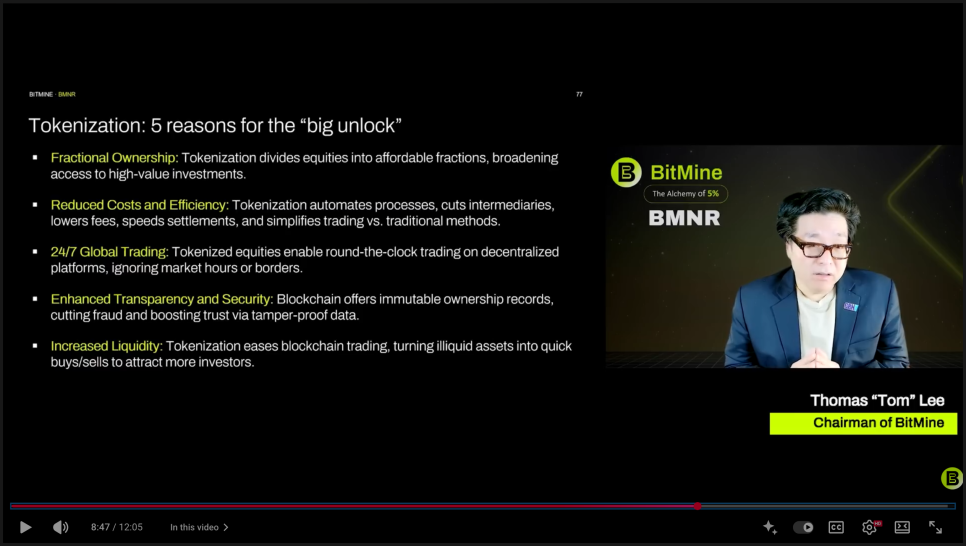 톰 리 회장이 그 다음으로 가장 힘을 준 영역은 바로 토큰화인데요. 토큰화가 금융 구조 자체를 다시 설계하는 변화이며, 이 변화의 중심이 이더리움이라는 점을 재차 강조했습니다.
