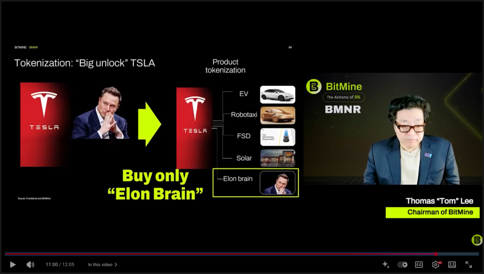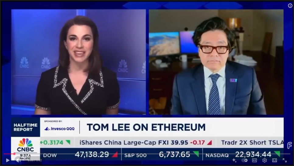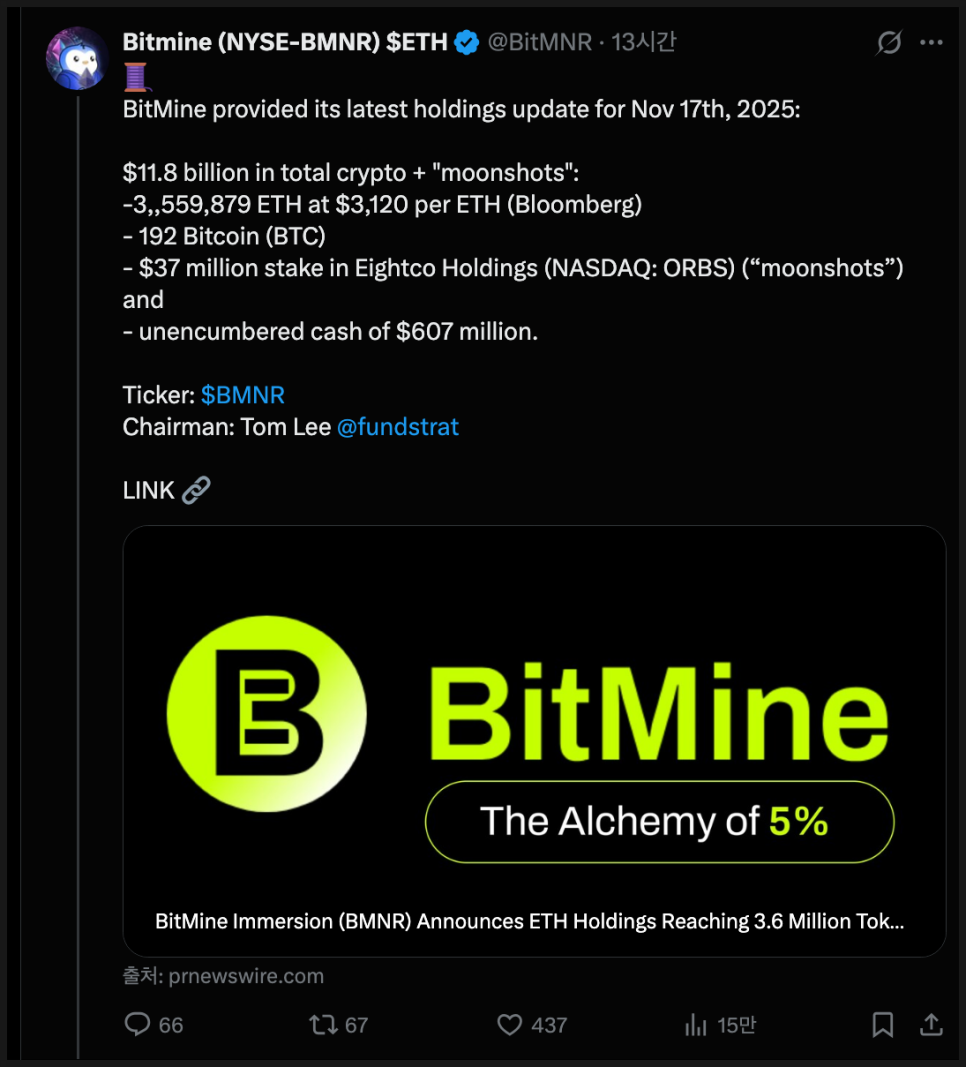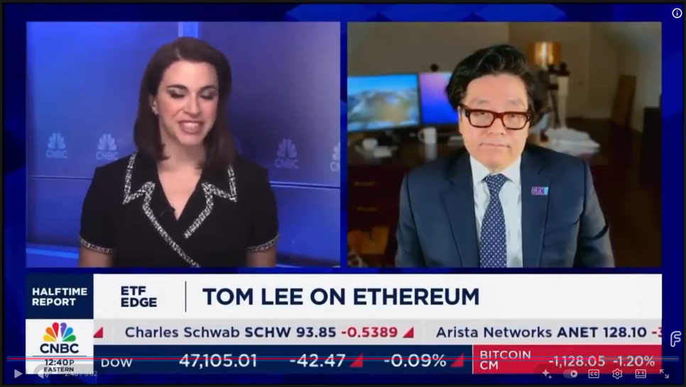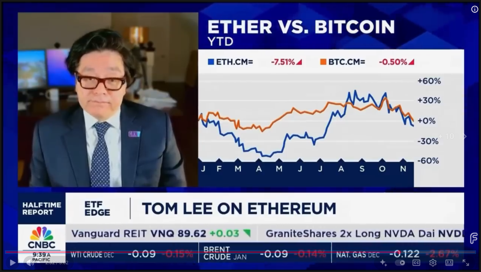 물론 이런 발언은 시장 상황과 정반대의 흐름을 보일 때 더욱 논란을 부릅니다. 코인이 떨어지고 있으니까 코인에 커리어를 걸고 있는 양반이 '무슨 말을 하는가 보자' 싶어 인터뷰에 불렀는데 “이번 주에 바닥을 찍을 가능성이 있다”라는 발언을 하니 진행자 역시 그 부분을 방송 말미에 다시 짚고 넘어갔는데요. 이더리움 뿐만 아니라 BMNR 주식 가치마저 실시간으로 급락하고 있는 상황이라 이번 주에 바닥이 등장하지 않으면 조롱을 피하기가 어려워 보입니다.