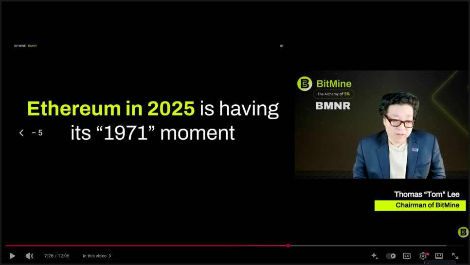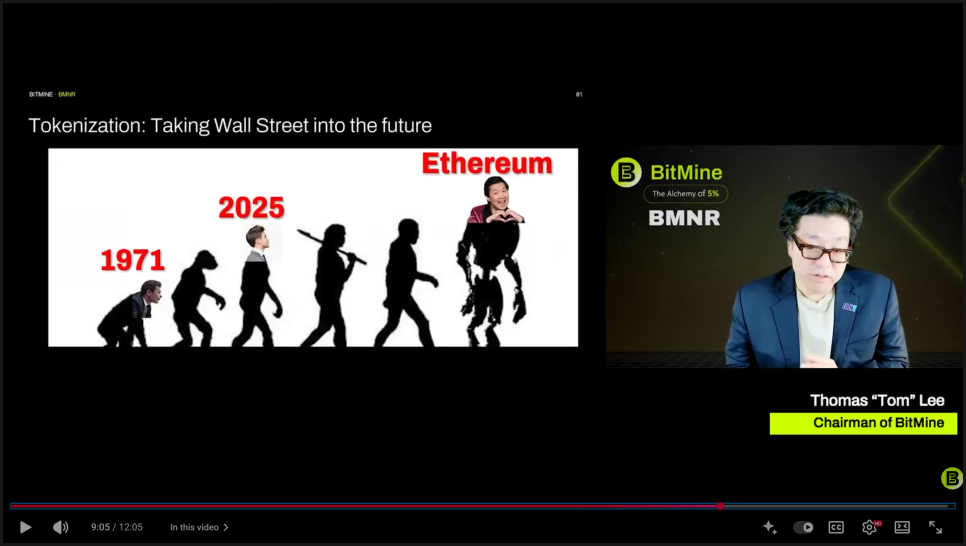 이런 설명을 마친 뒤 그는 토큰화가 2025년의 이더리움을 1971년의 월스트리트와 같은 위치에 놓아주고 있다고 강조했습니다. 앞서 언급했듯이 1971년은 미국이 금본위제를 종료하고 현대 금융시장 구조가 본격적으로 태어난 시기입니다. 그는 지금의 이더리움이 바로 그때의 월가처럼 새로운 금융 인프라로 도약하는 초기 단계라고 표현했는데요.