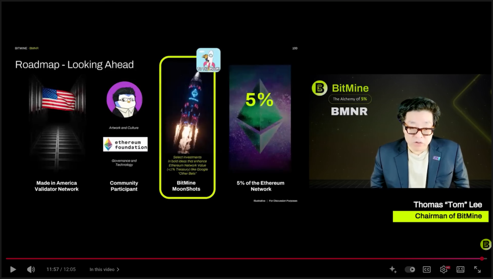 마지막으로, 그는 비트마인의 로드맵을 짧게 언급했는데요. 단순한 이더리움 장기 보유가 아니라, 커뮤니티 참여, 신기술 실험을 의미하는 문샷 프로젝트, 그리고 장기적으로는 ‘Alchemy 5%’라는 목표를 현실화하는 다양한 전략적 행동을 이어갈 것이라는 점을 다시 강조했죠.