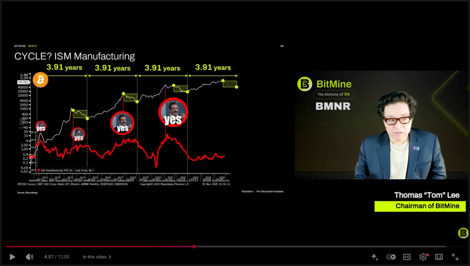 그런데 현재 구리 대 금 비율도, ISM 지수도 모두 아직 경기 과열 신호에서 상당히 떨어진 위치에 있다는 점에서, 톰 리는 비트코인이 사이클의 고점에 도달하지 않았다고 말합니다. 현재 ISM 지수는 48.7로, 경기 확장 기준선 50을 밑돌고 있습니다. 이는 곧 산업 활동이 정점에 올라서지 않았다는 의미이며, 비트코인이 사이클의 정점을 찍었다고 보기 어렵다는 뜻이기도 합니다.