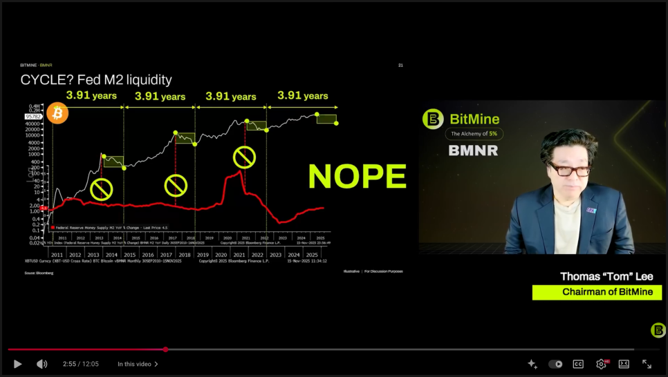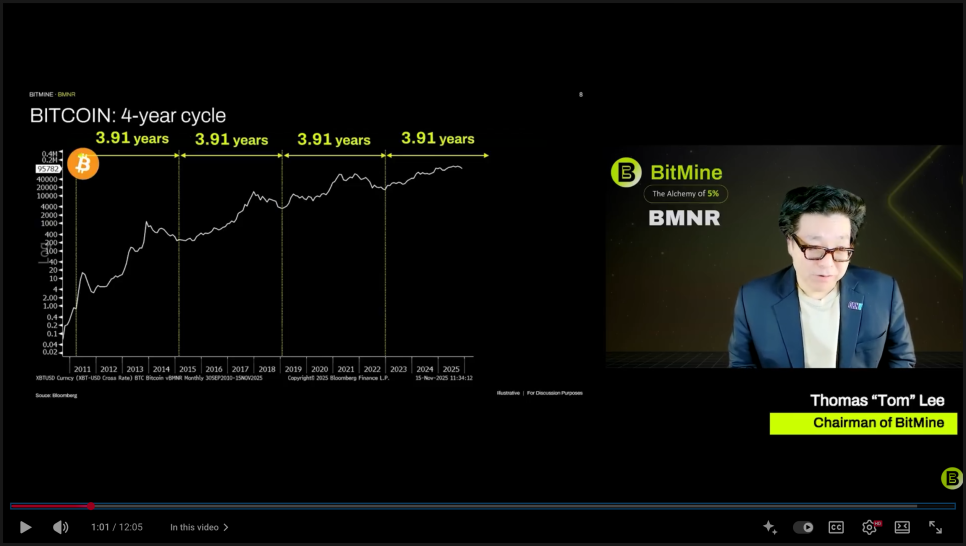 톰 리 회장은 먼저 비트코인의 가격이 과거에 ‘4년 주기’로 움직여 왔다는 통념을 다시 짚고 넘어가는데요. 흥미로운 점은, 그가 과거에는 이 설명을 적극적으로 지지했음에도 불구하고, 이제는 그 공식을 더 이상 그대로 믿기 어렵다고 공개적으로 인정했다는 점입니다.