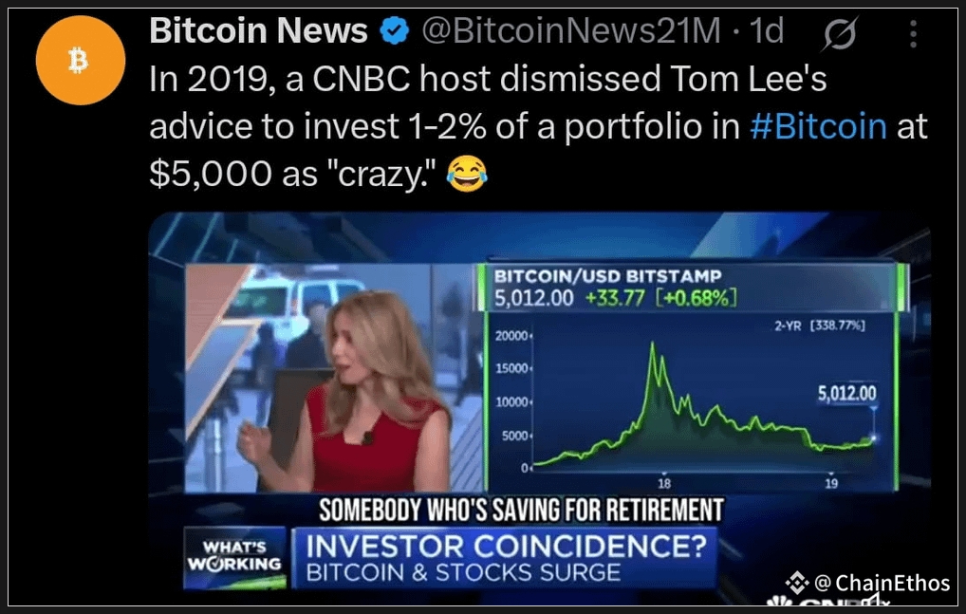 그런데 최근에 또 회자가 되고 있는 게 2019년의 CNBC 인터뷰인데요. 당시 CNBC 진행자는 당시 5천 달러대에 있던 비트코인을 1~2퍼센트만 포트폴리오에 담으라는 톰 리의 조언을 듣고 “미쳤다”고 말했는데, 결국 그 조언은 역사적으로 적중한 것으로 드러났습니다.
