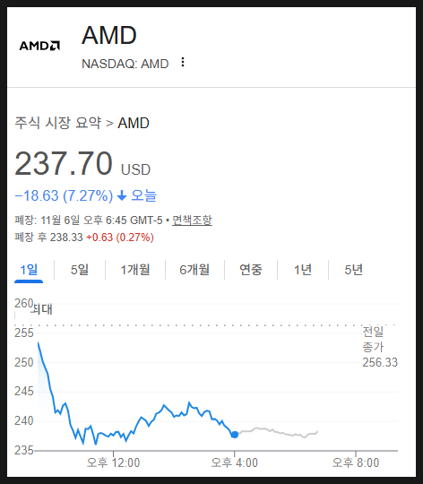 AMD의 주가는 전일대비 7.27%하락한 237.70달러에 장을