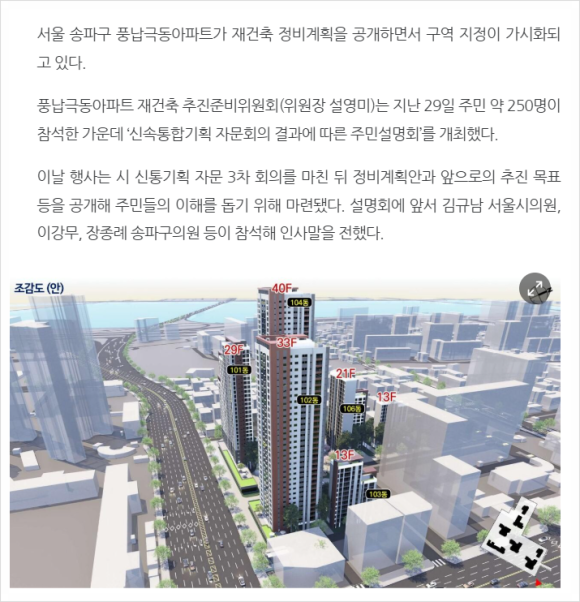 풍납극동아파트는 송파구 풍납동에 위치하며 최근 재건축 정비계획을 공개하면서 구역지정이 임박하였다. 풍납극동 재건축 추진위원회는 신통기획 자문회의 결과에 따른 주민설명회를 최근 개최했다. 이날은 신통기획 자문 3차를 마친 뒤 정비계획안과 앞으로의 추진 목표 등을 공개해 주민들의 이해를 돕도록 했다. 풍납극동 바로 옆에는 잠실올림픽공원아이파크가 있는데, 25평이 약 20억으로 평당 8천만원 수준이라 풍납극동의 시세 바로미터가 되어준다.