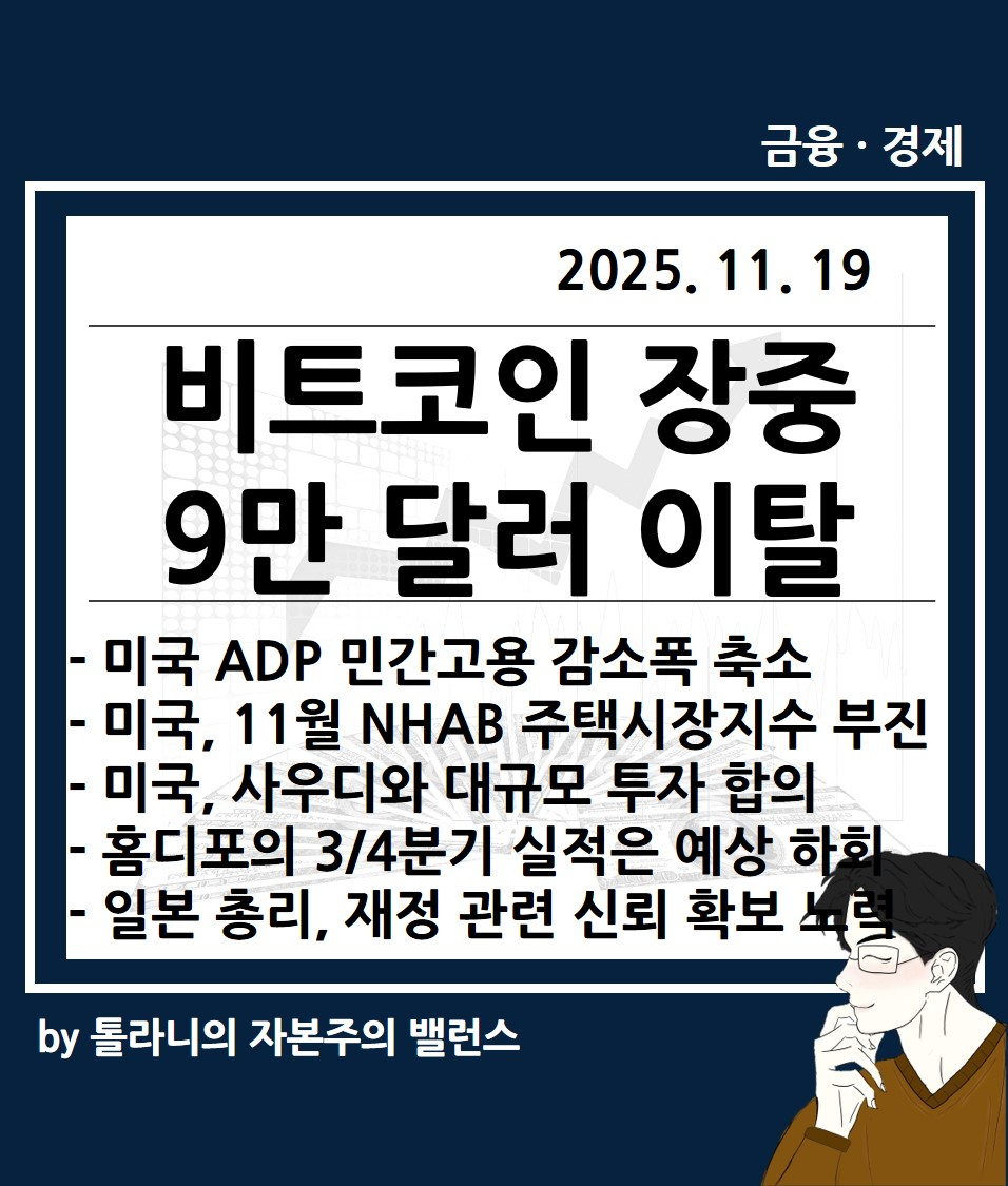 이에 ‘비트코인 장중 9만 달러 이탈, 미국 ADP 민간고용 감소폭 축소 등 뉴욕증시 및 주요 국가 경제/금융 동향’ 관련하여 언론 보도 및 국제금융센터 보고서를 통해 좀 더 자세히 알아보도록 하겠습니다.
