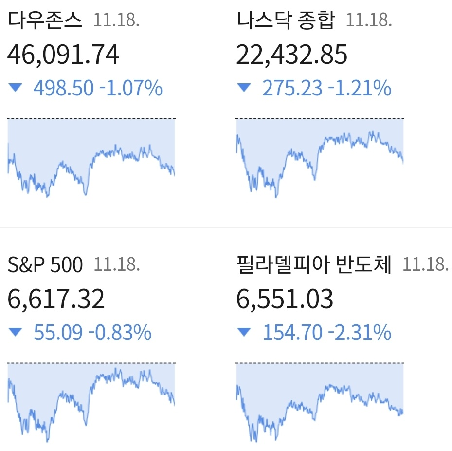 현지 시간 18일 미국 뉴욕증시는 3대 지수 모두 하락 마감하였습니다. AI 관련 기술주들이 연일 약세를 이어가고 있으며, 비트코인은 한때 9만 달러 아래로 하락하였는데요.