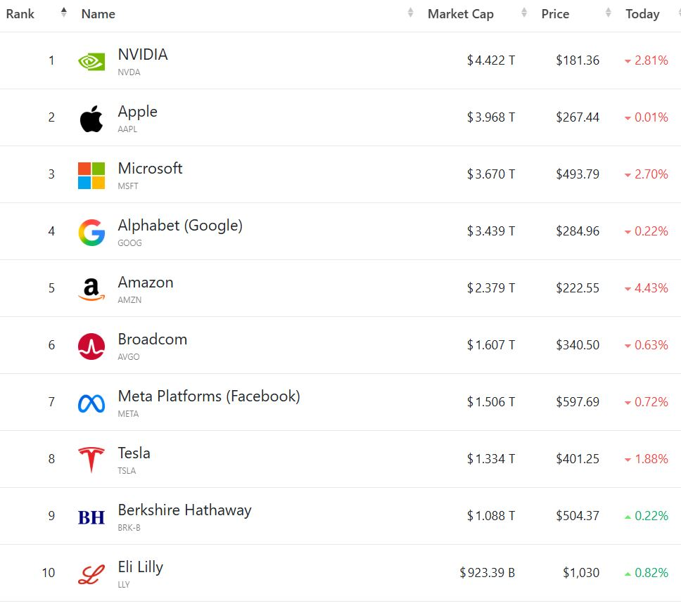 엔비디아는 전일 대비 -2.81% 하락하였으며, 애플 -0.01%, 마이크로소프트 -2.70%, 알파벳 -0.22%, 아마존 -4.43%, 메타 -0.72%, 테슬라 -1.88% 일제하 하락하면서 거래를 마쳤습니다.