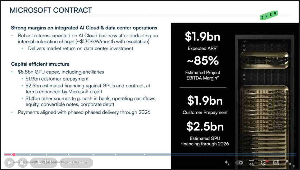 인터뷰어가 지적했듯, IREN은 2023년부터 공개한 목표들을 매년 정확히 달성해왔고, 그 점이 투자자들 사이에서 높은 신뢰를 만들어왔습니다. 이 신뢰가 최근의 대규모 AI 계약을 이끌어낸 배경이기도 합니다.