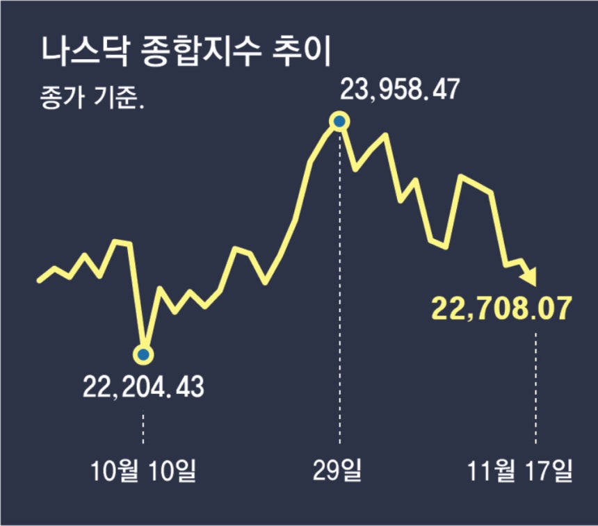 문남중 대신증권 연구원은 “10월에 미 증시가 사상 최고치를 경신한 데 따른 자연스러운 주가 조정”이라며 “엔비디아 실적과 미국 고용지표 발표 뒤 ‘안도 랠리’가 이어질 수 있다”고 내다봤음