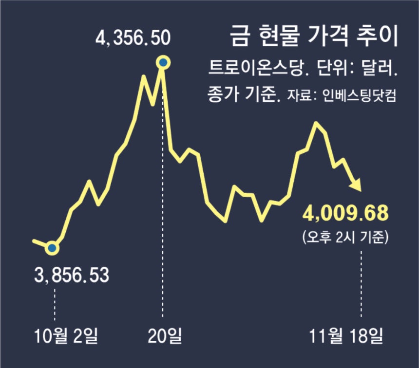 금 현물도 전날 대비 1% 가까이 하락한 트로이온스(약 31.1g)당 4000달러 선에서 거래