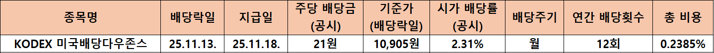 오늘은 KODEX 미국배당다우존스의 11월 배당 데이터를 기준으로 최근 배당 흐름과 시가배당률 변화를 차분히 점검해보려 합니다.