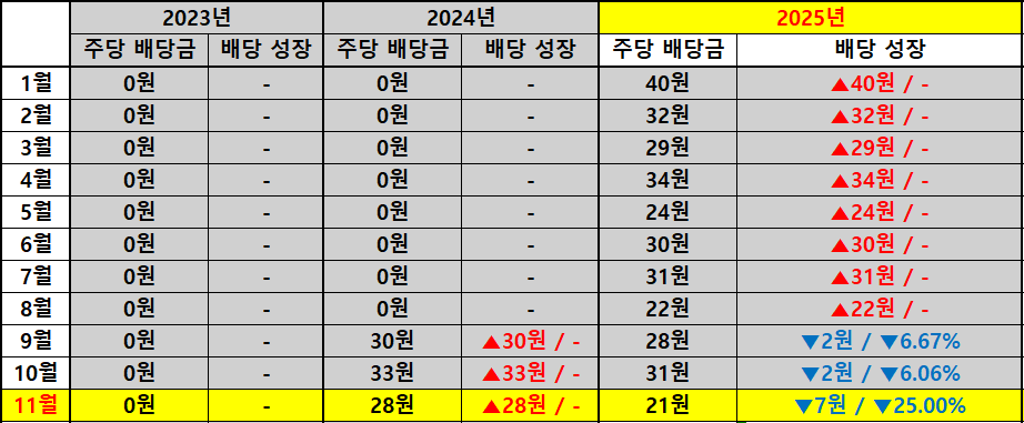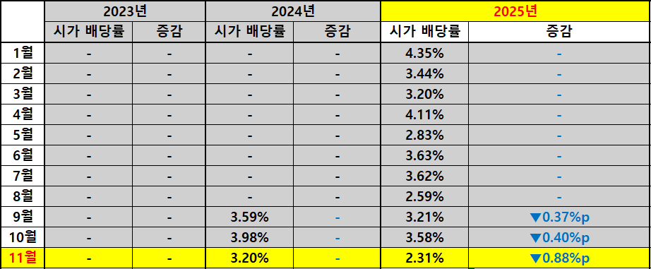 우선 이번 11월의 -25.00% 배당 감소는 분명 아쉬운 지점입니다. 특히 주가가 +3.70% 상승한 상황에서 배당이 감소했기 때문에 지금 시점에서 신규 진입을 고려하는 투자자는 과거와 동일한 기대 배당률을 가정하기보다는 낮아진 시가배당률을 전제로 접근해야 합니다.