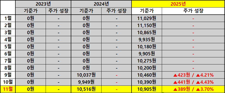 지난해 같은 11월 배당금은 28원이었고 올해는 21원이었기 때문에 -7원 감소했고 YoY 기준으로는 -25.00%의 조정입니다. 같은 기간 기준가는 10,516원에서 10,905원으로 +389원 증가하며 +3.70% 상승했습니다. 배당금은 감소하고 가격은 상승한 구조라 시가배당률은 3.20%에서 2.31%로 -0.88%p 낮아졌습니다.