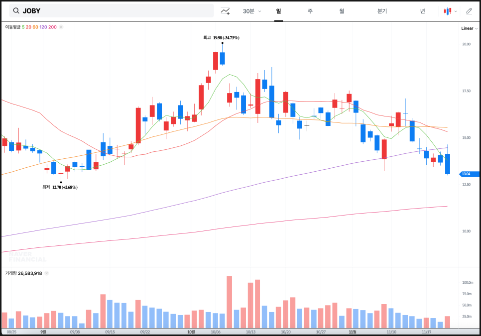 다음으로 JOBY 차트입니다. 일봉 차트는 10월 초 고점(약 19.98달러)을 찍은 뒤 꾸준히 밀리면서 단기 하락 추세가 형성된 모습을 보여줍니다. 5일과 20일 이동평균선 아래에서 캔들이 계속 머무르고 있고, 반등이 와도 단기선 위에서 힘 있게 안착하지 못하면서 매수세가 주도권을 되찾지 못하고 있습니다.