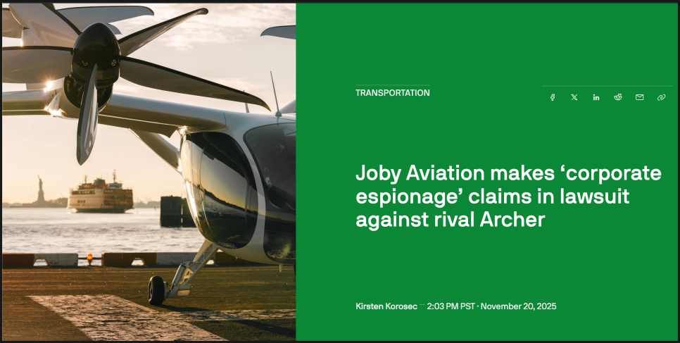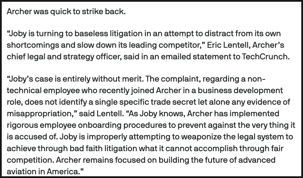 로이터(Reuters)와 테크크런치(TechCrunch)의 보도에 따르면 조비는 이 사건을 “계획되고 의도적인 기업 스파이 행위”라고 표현하며, 아처가 조비의 독점적 파트너십 계약 내용을 개발사에 전달해 조비의 입지를 흔들었다고 주장하고 있습니다. 반면 아처는 즉각 반박하며, 조비의 주장이 “근거 없고 악의적이며 경쟁에서 밀리자 소송을 이용하려는 것”이라고 밝히고 있습니다.