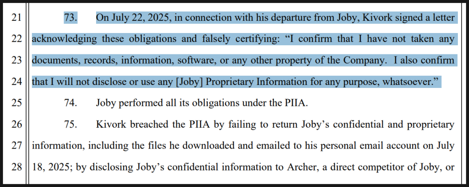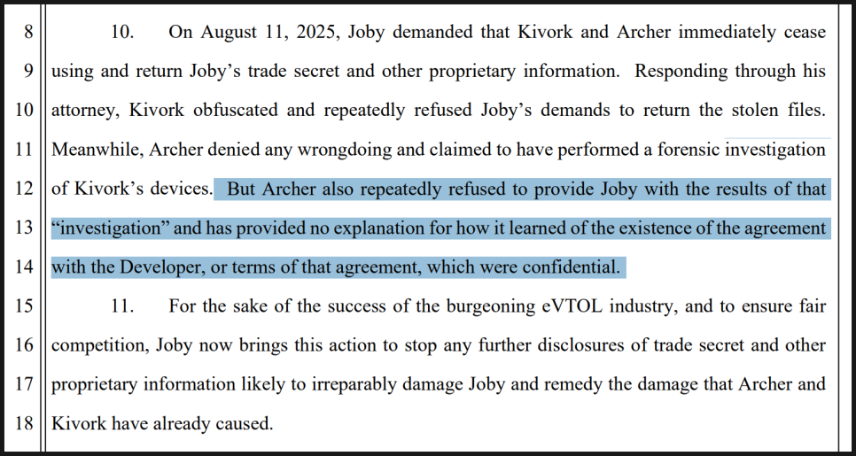 아처(Archer)의 대응 방식도 소장 안에서 중요한 요소로 다뤄집니다. Archer는 내부 조사를 실시했다고 Joby에게 알려왔지만, 그 조사 내용이나 기술적 검증 결과를 제공하라는 Joby의 요구에는 전혀 응하지 않았다고 합니다. 조비는 이를 두고 아처가 실제로 어떤 조사를 했는지조차 알 수 없었다는 점을 문제로 제기했습니다.