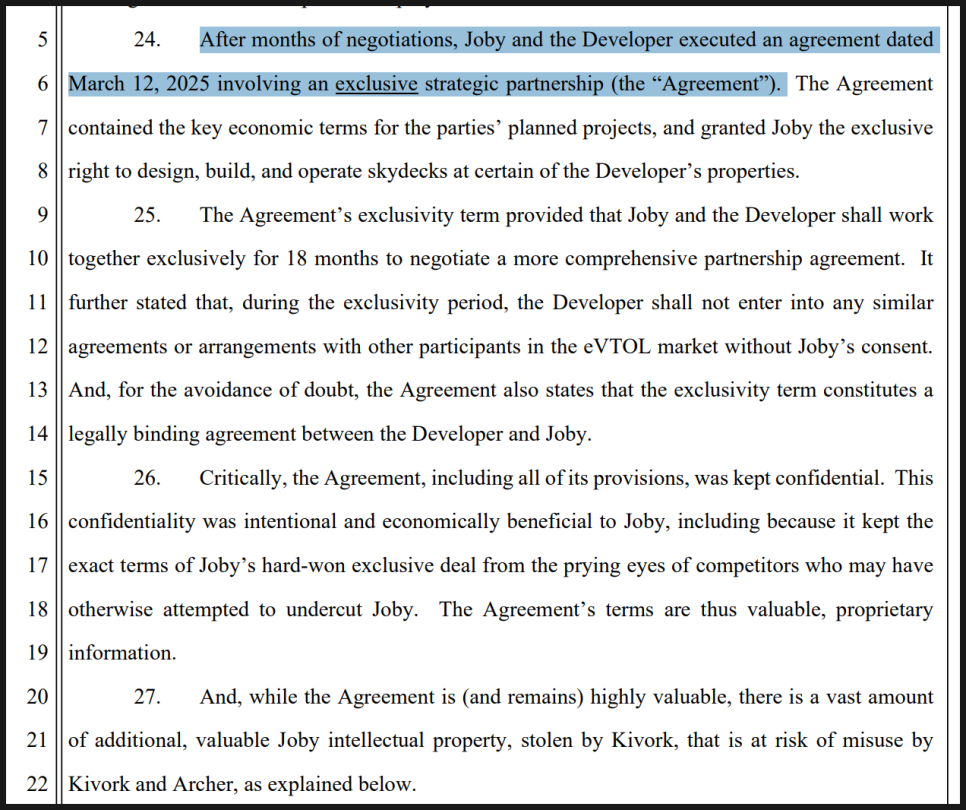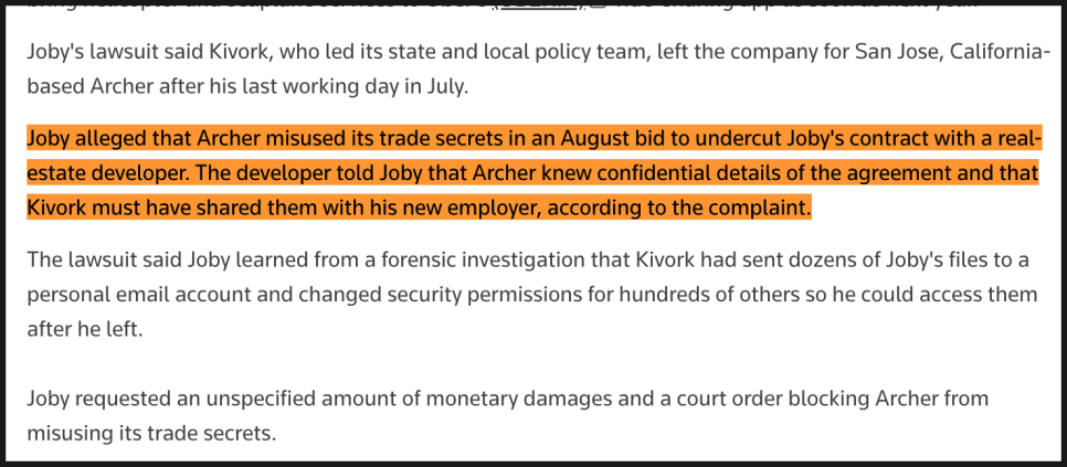 또한 소장에는, 키보크(Kivork)가 접근한 파일 중 일부가 조비(Joby)가 대형 부동산 개발사와 체결한 18개월 독점 계약의 상세 조항을 포함하고 있었다는 내용도 구체적으로 담겨 있습니다. 해당 개발사는 Joby와 비공개로 조건을 조율해 온 곳인데, 조비는 소음 측정자료, 부지별 운영 전략, 공항 접근성 분석 자료 등 고도화된 시뮬레이션 결과까지 키보크가 외부로 유출했다고 주장합니다. 실제로 사건 직후 개발사는 조비에게 “아처가 우리 독점 계약의 핵심 조항을 알고 있었다”고 밝혔으며, 그 정보 출처가 키보크일 것이라고 거의 단정적으로 언급한 것으로 기록되어 있습니다.