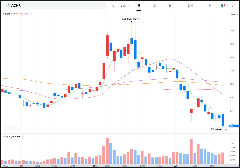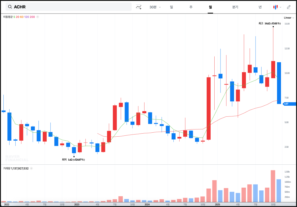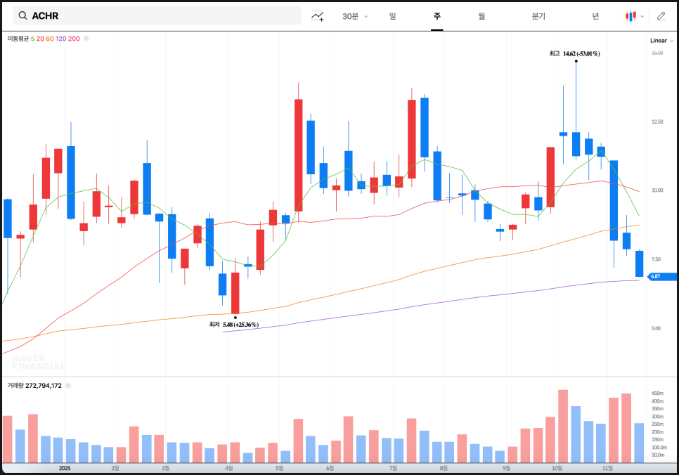 주가 차트를 좀 더 세부적으로 분석할 건데, 아처(ACHR) 주가 차트부터 살펴보겠습니다.